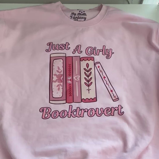For the readers who’d rather be lost in a book than out on the town, the Just a Girly Booktrovert sweatshirt is the perfect blend of cozy, cute, and bookish charm. Featuring a soft pink palette and an illustrated row of decorative books with heart and floral details, this design celebrates introverted girls who find their happy place between the pages.